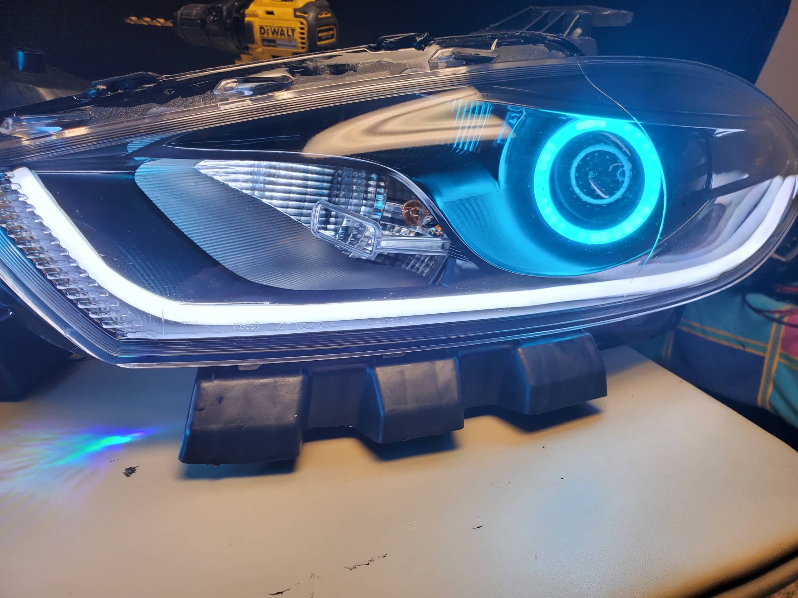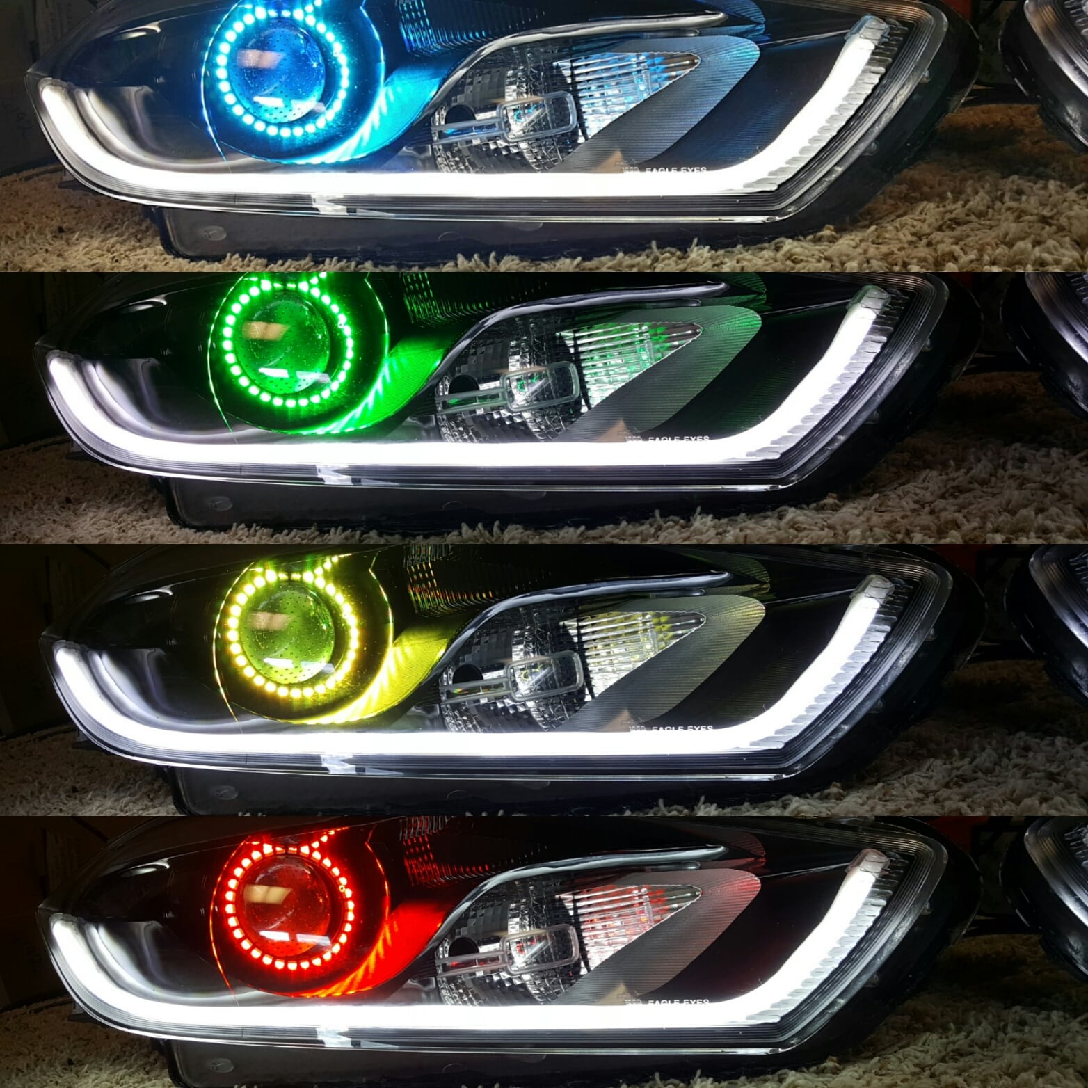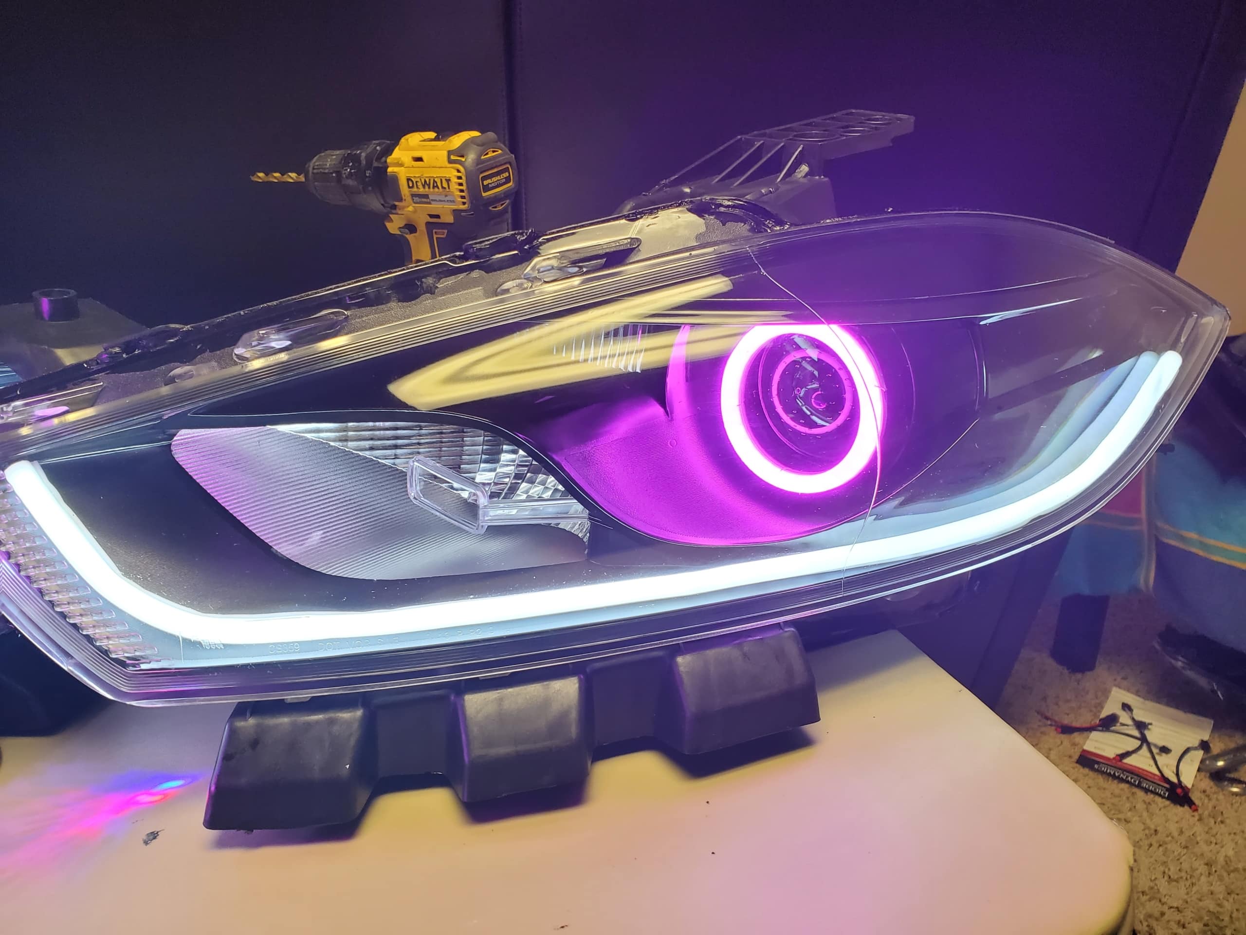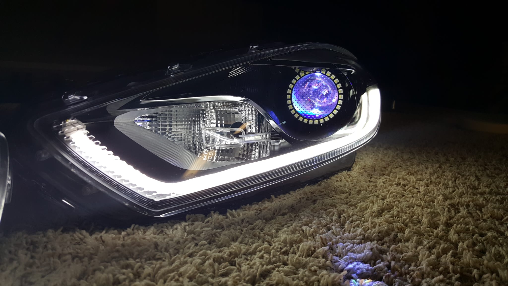We have taken a reproduction headlight and modified to really allow your dodge dart to standout from the pack. We install Diode Dynamics RGBW demon eyes which can virtually make any color as well as contains a photosensor which turns the demon eye off when the low beam bulb is on, cool right? With the usage of the RGBW bluetooth phone or tablet controlled controller you can dial in exactly the color of the demon eye, use a series of pre-programmed modes, or create your own sequence of colors.